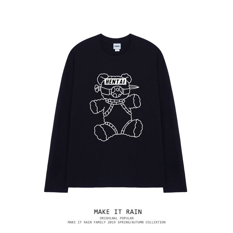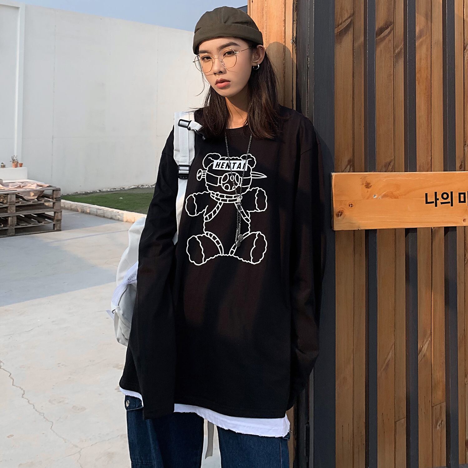 スタンダードダークプリント柄ラウンドネックルーズブラックレディースTシャツ ロング レトロ Oネック MAKE_ITRAIN26754215828